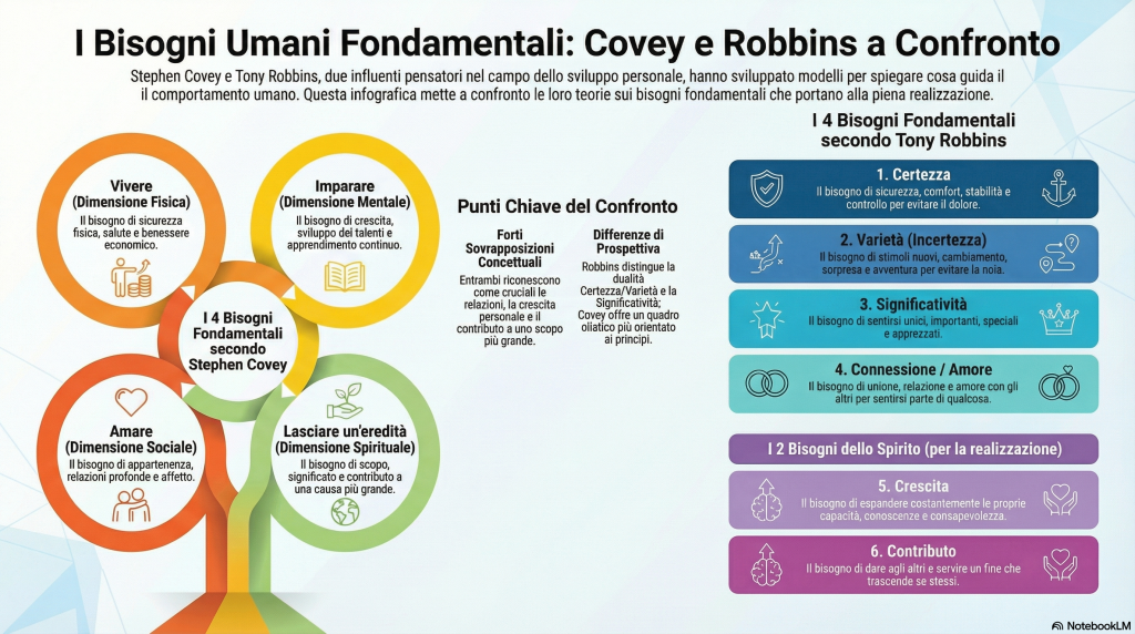 • Bisogni Unici di Robbins: Robbins identifica esplicitamente la Varietà (la spinta verso la novità) e la Significatività (il desiderio di sentirsi unici) come bisogni fondamentali a sé stanti. Covey non isola questi concetti allo stesso modo. Questa granularità psicologica rende il modello di Robbins più efficace per interventi mirati su comportamenti specifici, come la gestione di un team composto da personalità che richiedono sfide costanti (alta Varietà) o riconoscimenti pubblici (alta Significatività).