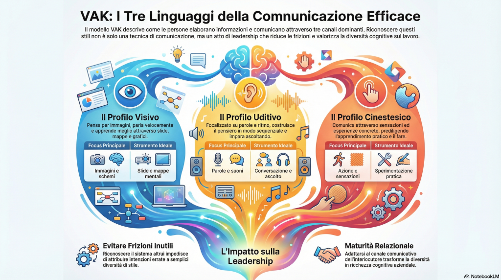 In conclusione, riconoscere il VAK non è solo una tecnica di coaching, ma un pilastro della leadership moderna. Capire “da dove” comunicano i nostri colleghi è il primo passo per costruire un ambiente di lavoro più empatico, produttivo e consapevole.