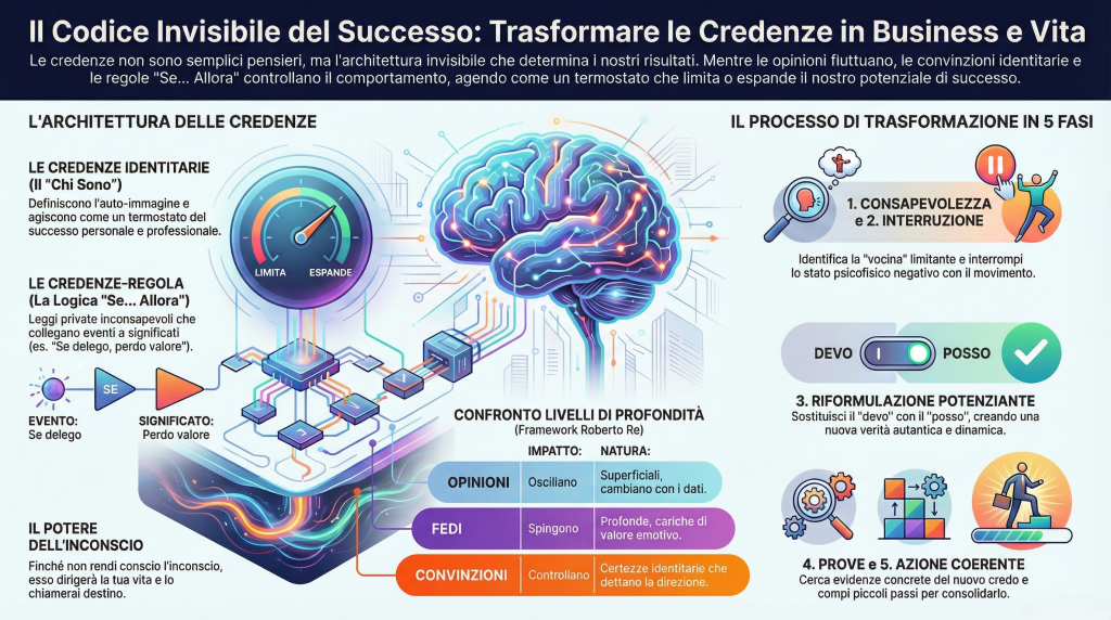 Fonti: Le idee esposte sono tratte da insegnamenti e pubblicazioni di esperti di crescita personale come Roberto Re, Tony Robbins e dalle prospettive della psicologia di Carl G. Jung e Sigmund Freud, rielaborate e integrate con esempi pratici. In particolare, Roberto Re descrive la distinzione tra credenze generali, d’identità e regole nelle sue opere e corsi[3][11], evidenziando anche che “ogni comportamento è guidato dalle credenze”[1]. Tony Robbins, nei suoi corsi e conferenze, sottolinea il potere delle credenze nel determinare la nostra esperienza (affermando ad esempio che “le credenze hanno il potere di creare o distruggere”[12]) e offre strategie per trasformare le convinzioni limitanti in convinzioni potenzianti[26][23]. Dal lato della psicologia, abbiamo citato il famoso principio attribuito a Jung sul portare alla coscienza l’inconscio perché non ci domini come un destino[8], nonché le intuizioni di precursori come Gustave Le Bon sul carattere inconscio e “di fede” delle credenze radicate[13]. Queste fonti convergono tutte su un punto: comprendere e modificare le proprie credenze è la chiave per un cambiamento profondo e duraturo, sia nella vita personale che nel contesto professionale.